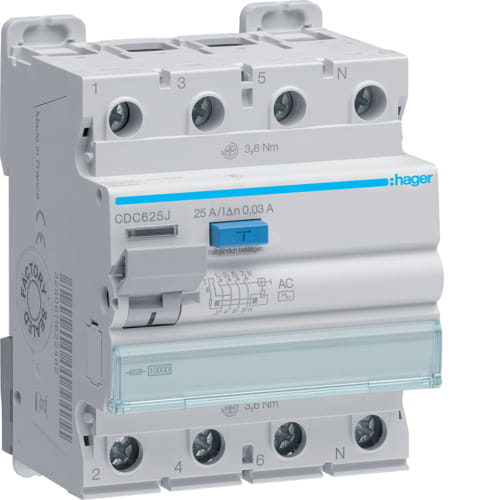 RCCB Wyłącznik różnicowoprądowy 3P+N 25A 30mA 10kA AC Hager CDC625J
