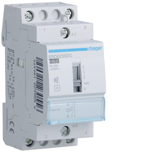 Stycznik cichy z możliwością sterowania ręcznego 24V DC 2NO 25A Hager ERD625SDC