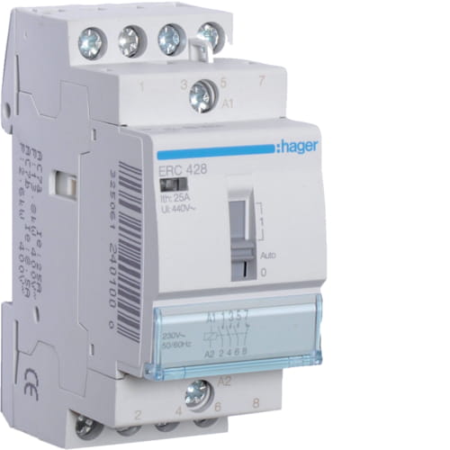Stycznik z możliwością sterowania ręcznego 230VAC 3NO+1NC 25A Hager ERC428